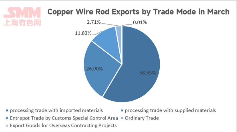 In March 2026, exports of copper wire rod (HS code 74081100, 74081900) declined MoM, primarily due to chain reactions triggered by escalating geopolitical conflicts, compounded by a cyclical pullback in the prior export pace. The escalation of geopolitical conflicts disrupted international shipping and drove up logistics costs, significantly increasing the difficulty and cost of exports. This, combined with the onset of the off-season following the concentrated release of earlier orders, collectively dragged down exports. By specific trade mode, in March 2026, processing trade with imported materials accounted for 58.55% of total copper wire rod exports, processing trade with supplied materials accounted for 26.9%, Entrepot Trade by Customs Special Control Area accounted for 11.83%, and Ordinary Trade accounted for 2.71%.