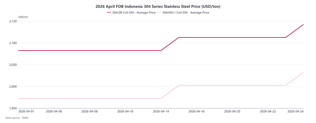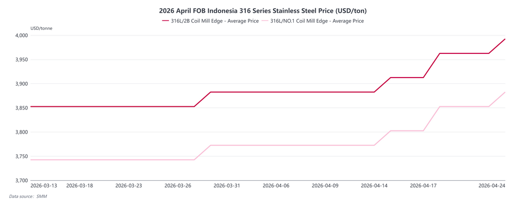 Based on SMM research, the week of April 20 to April 24, 2026, Indonesian stainless steel export prices followed a stable then surging trend. While quotations remained steady early in the week due to prevailing market caution, they collectively rose by USD30/mt by Friday (April 24). This increase was driven by rising nickel ore prices, which pushed NPI (Nickel Pig Iron) production costs higher, lifting FOB Indonesia 300-series prices. Notably, driven by rising global molybdenum costs, 316-series prices are now approaching the USD4,000/mt threshold.