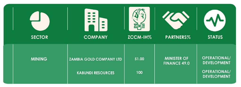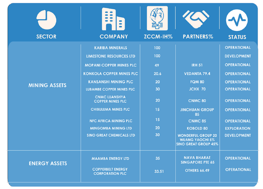 ZCCM-IH occupies a very unique and strategic position as it holds key interests across the mining and energy industries in Zambia. The following is a list of companies in ZCCM-IH’s portfolio: