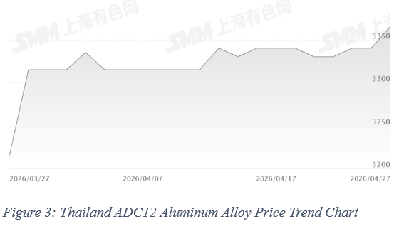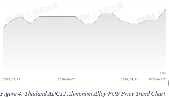 For ADC12 secondary aluminum alloy ingots, the Thai market remained stable last week. Domestic prices were concentrated in the range of THB 106–108/kg, with a weekly average of around THB 107.50/kg. FOB prices were stable within USD 3,310–3,350/mt, averaging approximately USD 3,340/mt.