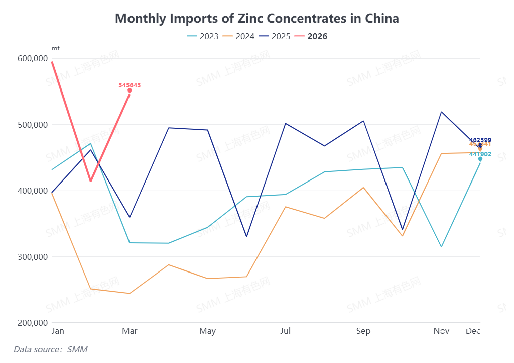 According to the latest customs data, China imported 545,600 mt in physical content of zinc concentrates in March 2026, up 31.8% MoM from February (131,700 mt in physical content) and up 51.78% YoY. Cumulative zinc concentrates imports from January to March totaled 1.5544 million mt in physical content, up 27.64% YoY cumulatively.