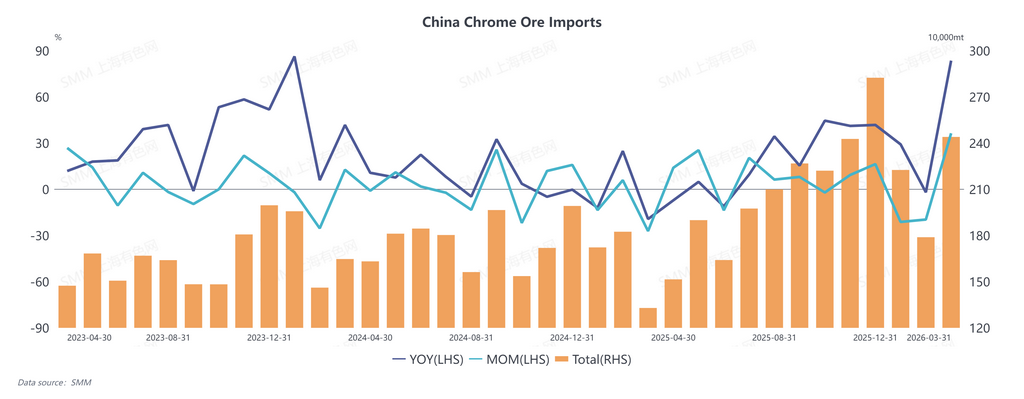 По данным таможенной статистики Китая, общий объём импорта хромовой руды в Китай в марте 2026 года составил 2,4402 млн тонн, увеличившись на 36,42% по сравнению с предыдущим месяцем и на 83,58% в годовом исчислении. Из общего объёма импорт из Южной Африки составил 1,966 млн тонн, увеличившись на 36,79% к предыдущему месяцу и на 97,05% в годовом исчислении; импорт из Турции — 101 600 тонн, снизившись на 5,15% к предыдущему месяцу, но увеличившись на 77,67% в годовом исчислении; импорт из Зимбабве составил 169 100 тонн, снизившись на 3,6% к предыдущему месяцу и на 10,14% в годовом исчислении.