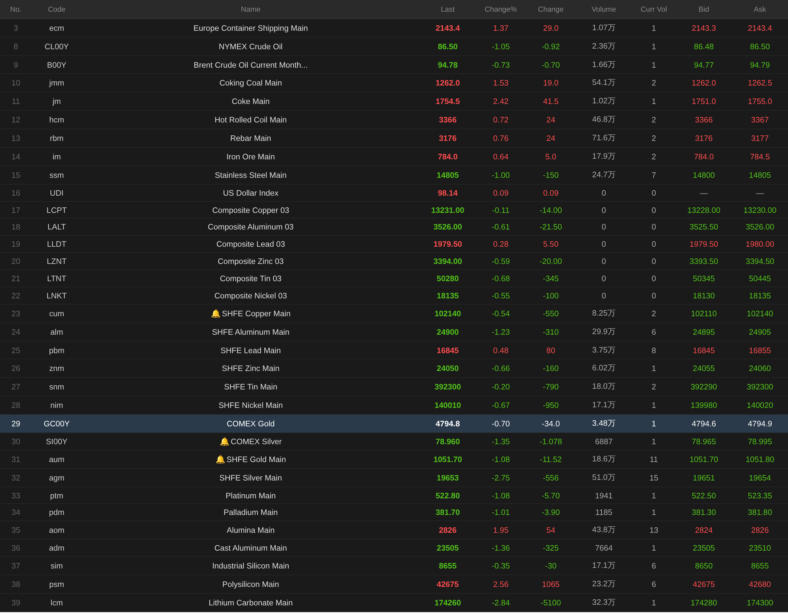 По итогам дневной сессии большинство базовых металлов на внутреннем рынке снизились; единственным выросшим стал свинец на SHFE — +0,48%. Лидером падения стал алюминий на SHFE — −1,23%, остальные металлы снизились менее чем на 1%. Ближний контракт на глинозём вырос на 1,95%, а ближний контракт на литейный алюминиевый сплав снизился на 1,36%.