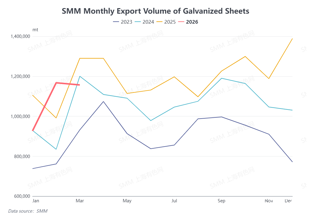 According to the latest customs data, galvanized sheet exports totaled 1.157 million mt in March 2026, up 30.13% MoM and up 7.48% YoY. Cumulative galvanized sheet exports from January to March reached 3.2512 million mt, down 4.02% YoY.
