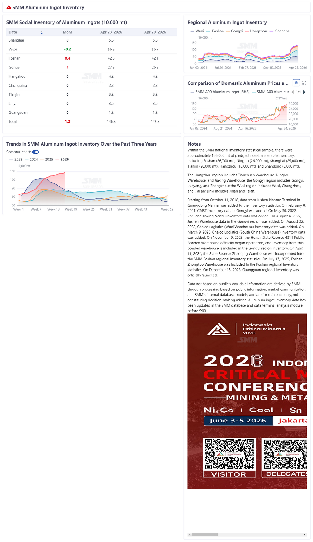 ตามสถิติของ SMM ณ วันที่ 24 เมษายน (วันพฤหัสบดี) สต๊อกทางสังคมของอะลูมิเนียมแท่งในพื้นที่บริโภคหลักของจีนอยู่ที่ 1.465 ล้านตัน เพิ่มขึ้น 42,000 ตันเมื่อเทียบรายสัปดาห์จากวันพฤหัสบดี บันทึกการสะสมสต๊อกต่อเนื่องหลายสัปดาห์ โดยขนาดการสะสมขยายตัวเพิ่มขึ้นเมื่อเทียบรายสัปดาห์ การเบิกสินค้าออกจากคลังรายสัปดาห์ฟื้นตัวเล็กน้อย 14,200 ตันเมื่อเทียบรายสัปดาห์มาอยู่ที่ 115,200 ตัน แต่การปรับตัวดีขึ้นของการเบิกสินค้ายังไม่ทันกับปริมาณสินค้าเข้าที่เพิ่มขึ้นเมื่อเร็วๆ นี้ และโมเมนตัมการลดสต๊อกอ่อนแอชัดเจน