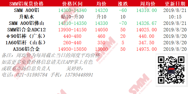 August 21 spot price of SMM aluminum: A00 aluminum month-on-month down 60 yuan / ton