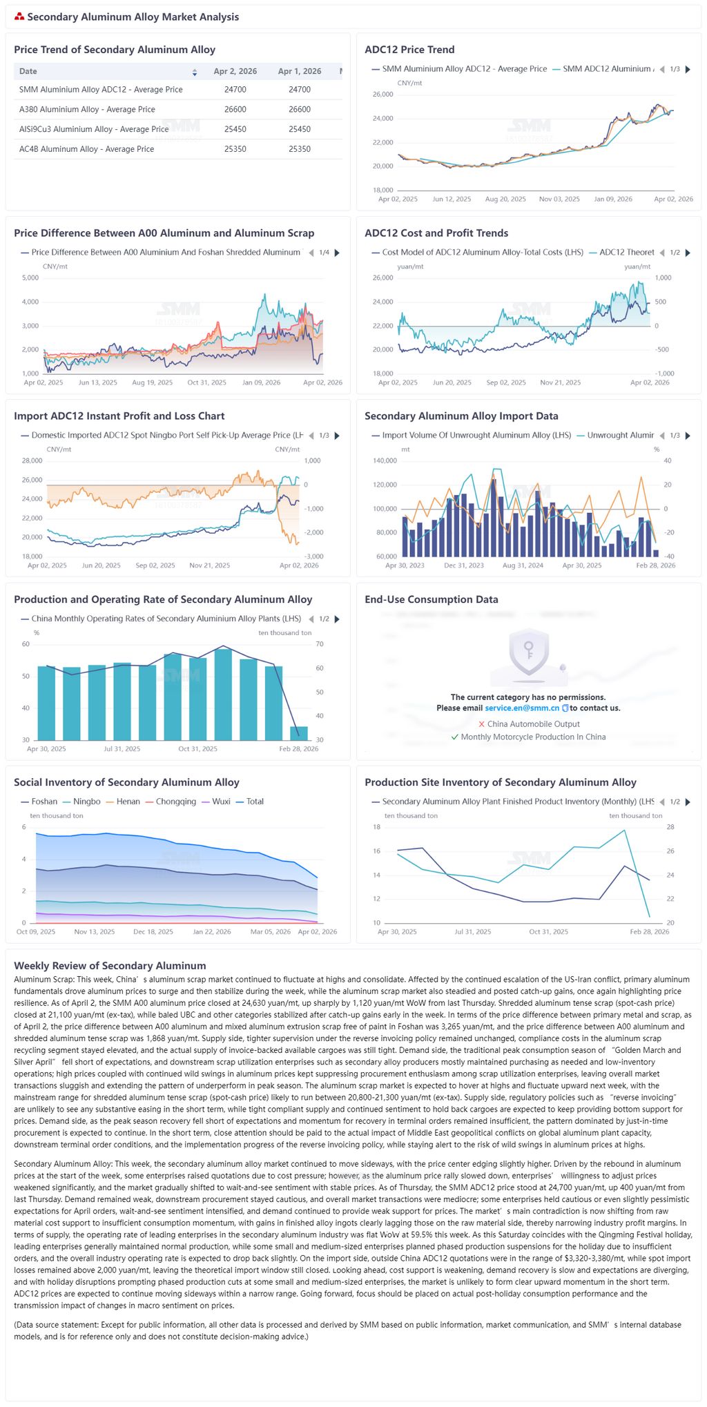 Trong tuần này, thị trường hợp kim nhôm tái chế tiếp tục đi ngang, với mặt bằng giá nhích tăng nhẹ. Đầu tuần, được hỗ trợ bởi đà phục hồi của giá nhôm, một số doanh nghiệp đã nâng báo giá do áp lực chi phí; tuy nhiên, khi đà tăng của giá nhôm chậm lại, mức độ sẵn sàng điều chỉnh giá suy yếu rõ rệt, và thị trường dần chuyển sang giữ giá ổn định trong tâm lý chờ đợi, quan sát. Tính đến thứ Năm, giá SMM ADC12 được ghi nhận ở mức 24.700 NDT/tấn, tăng 400 NDT/tấn so với thứ Năm tuần trước. Nhu cầu vẫn yếu, hoạt động mua hàng của hạ nguồn tiếp tục thận trọng và giao dịch chung trên thị trường ở mức trung bình; một số doanh nghiệp giữ kỳ vọng thận trọng, thậm chí hơi bi quan đối với đơn hàng tháng 4, tâm lý chờ đợi, quan sát gia tăng, và nhu cầu tiếp tục hỗ trợ yếu cho giá. Mâu thuẫn chính của thị trường hiện đang chuyển từ yếu tố chi phí nguyên liệu thô sang động lực tiêu thụ không đủ mạnh. Mức tăng của thỏi hợp kim thành phẩm chậm hơn đáng kể so với phía nguyên liệu, khiến biên lợi nhuận ngành tiếp tục thu hẹp. Về nguồn cung, tỷ lệ vận hành của các doanh nghiệp đầu ngành trong ngành nhôm tái chế tuần này giữ nguyên so với tuần trước ở mức 59,5%. Thứ Bảy này trùng với kỳ nghỉ Tết Thanh minh. Các doanh nghiệp đầu ngành phần lớn vẫn duy trì sản xuất bình thường, trong khi một số doanh nghiệp vừa và nhỏ dự kiến tạm ngừng sản xuất theo giai đoạn trong kỳ nghỉ do đơn hàng không đủ, và tỷ lệ vận hành chung của toàn ngành được dự báo sẽ giảm nhẹ trở lại. Về nhập khẩu, báo giá ADC12 ngoài Trung Quốc ở mức 3.320–3.380 USD/tấn, trong khi mức lỗ nhập khẩu giao ngay vẫn trên 2.000 NDT/tấn, khiến cửa sổ nhập khẩu theo lý thuyết vẫn đóng. Triển vọng sắp tới cho thấy hỗ trợ từ chi phí sẽ suy yếu, quá trình phục hồi nhu cầu diễn ra chậm với kỳ vọng phân hóa, và tác động của kỳ nghỉ cùng với việc cắt giảm sản xuất theo giai đoạn tại một số doanh nghiệp vừa và nhỏ sẽ khiến thị trường khó hình thành động lực tăng rõ ràng trong ngắn hạn. Giá ADC12 được dự báo sẽ tiếp tục đi ngang trong biên độ hẹp. Trong thời gian tới, cần theo dõi sát sao diễn biến tiêu dùng thực tế sau kỳ nghỉ và tác động lan truyền của những thay đổi trong tâm lý vĩ mô lên giá cả.