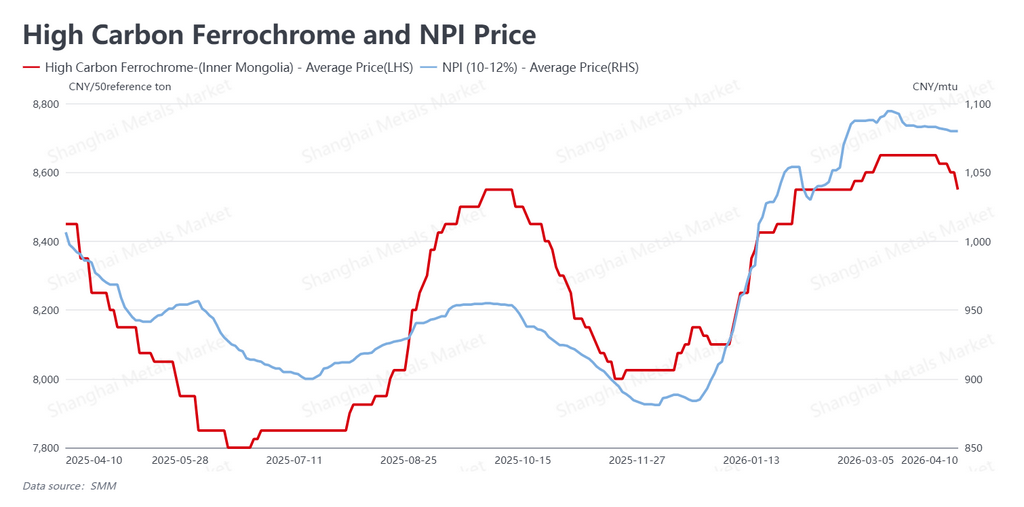 Về phía chi phí, Gang Niken (NPI) – nguồn nguyên liệu niken chính cho các nhà sản xuất thép không gỉ Trung Quốc – tiếp tục giảm dần xuống 1.080 NDT/điểm niken (khoảng 157 USD/điểm niken) tính đến ngày 10/4. Ferrochrome carbon cao giảm thêm xuống 8.550 NDT/50 tấn cơ sở (khoảng 1.243 USD/50 tấn cơ sở).