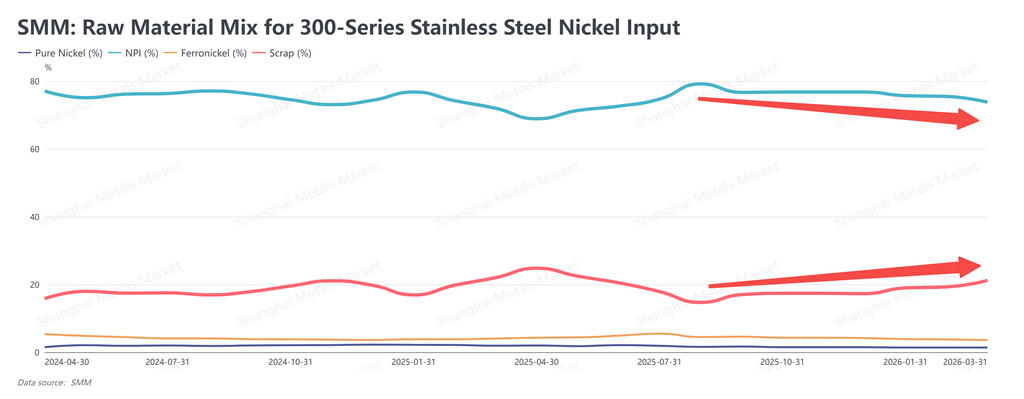 This preference is being amplified by a shift in charge mix design. Chinese mills have been steadily increasing the share of stainless steel scrap in their furnace feeds over recent years. But scrap typically doesn't carry enough nickel on its own, forcing producers to top up with nickel cathode or nickel briquettes — an expensive and operationally complex step. High-grade NPI solves both problems at once: its nickel content is high enough to reduce or even eliminate the need for supplemental nickel additions. The more scrap goes into the furnace, the more indispensable high-grade NPI becomes. This isn't a passing preference — it's a structural consequence of how charge mixes are evolving.