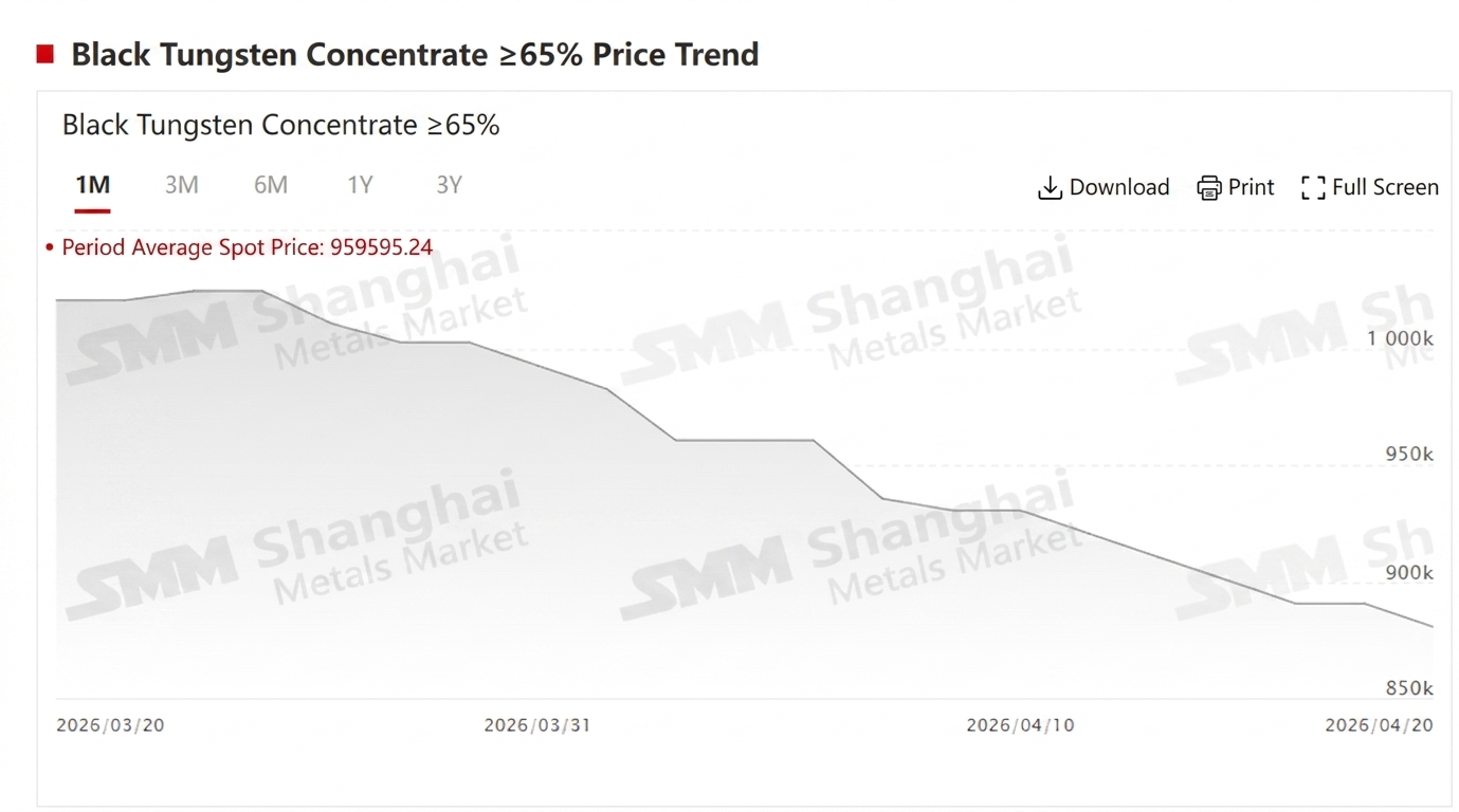 Since mid-to-late March, tungsten prices, which had repeatedly hit record highs, began to pull back under the combined impact of profit-taking by funds, downstream buyers staying on the sidelines due to high prices, and an overall adjustment in commodity markets. On April 20, wolframite concentrates (≥65%) were priced at 880,000–881,000 yuan/standard tonne (65%WO3 basis), with an average price of 880,500 yuan/standard tonne (65%WO3 basis), down 1.12% from the previous trading day. Compared with the historical high average tungsten price of 1,050,500 yuan/standard tonne (65%WO3 basis) on March 16, the average price of wolframite concentrates dropped by 170,000 yuan/standard tonne (65%WO3 basis) in just over a month, a decline of 16.18%.